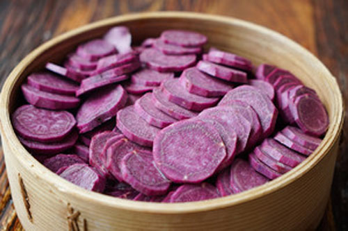 步驟一:380g紫薯去皮切薄片,蒸籠中的水煮沸后,將其放至鍋上蒸15分鐘。