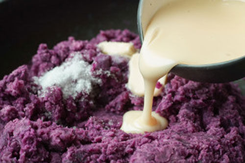 步驟二:取出,將的紫薯壓成泥,備用。另起鍋,開(kāi)小火,倒入紫薯泥、15g白砂糖、30g黃油、60g煉乳和15g淡奶油翻炒,攪拌均勻,冷卻備用。