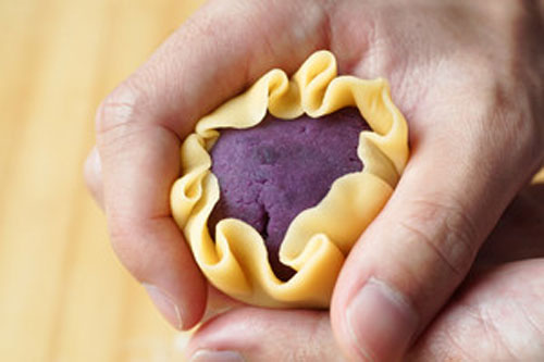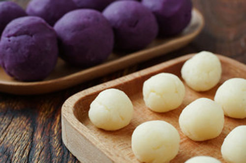 步驟三:將91g拉芝士平均分為每個(gè)7g,搓圓,紫薯泥均分為每個(gè)35g左右搓圓,用紫薯泥將馬蘇里拉芝士裹住,搓成團(tuán),蓋上保鮮膜放置一邊備用。