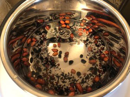 步驟二:糯米紅豆黑米黑豆花生淘洗干凈倒入電飯煲,加1000ml清水。