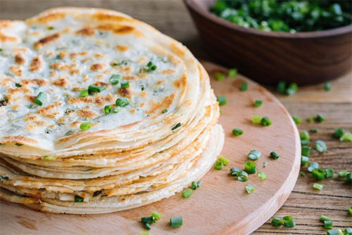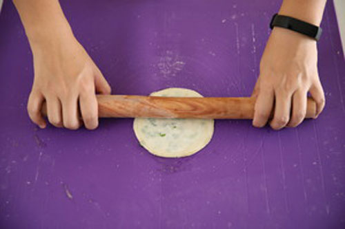 步驟二:蓋上第二張餃子皮,重復(fù)步驟,一共是六張餃子皮疊在一起,用搟面杖將餅皮搟成又大又圓的一片,鍋內(nèi)下少量植物油,中火將蔥油餅兩面烙至金黃色即可。