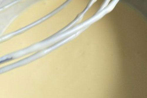 步驟四:加入蛋黃,“之”字型攪拌至面糊光澤細(xì)膩,滴落有輕紋。