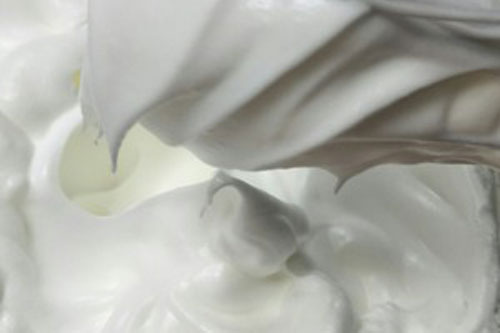 步驟五:蛋白里滴入檸檬汁,白糖分三次加入打發(fā)至大彎勾狀態(tài)。全程低速打發(fā),打發(fā)好的蛋白光澤細(xì)膩,是彎鉤不是硬挺的尖鉤。