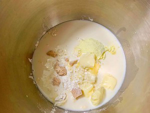 步驟一:除了黃油和鹽,所有材料放入廚師機(jī)攪拌桶,設(shè)置5檔揉10分鐘,然后加入黃油和鹽,繼續(xù)揉5分鐘左右,至延展性超級(jí)好。