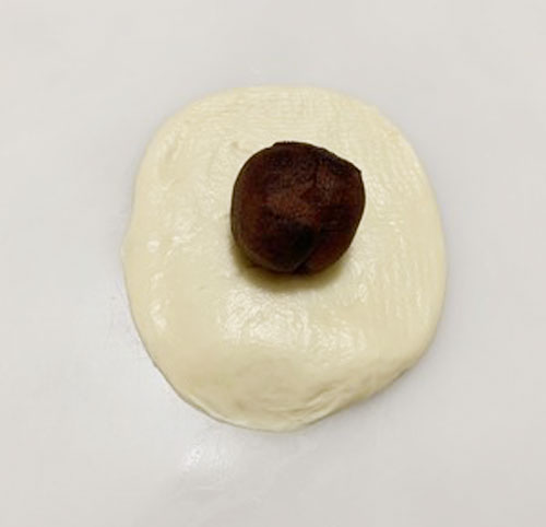 步驟四:取一份面團(tuán)壓扁,包入豆沙餡,依次包好所有的面團(tuán),捏緊收口,朝下放在桌面,松弛10分鐘。