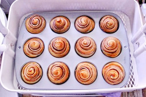 步驟五:取一份面團(tuán)用搟面杖搟開成長橢圓形,然后從一頭卷起來,注意卷緊,依次卷好所有面團(tuán)。再次松弛15分鐘,將松弛好的面團(tuán)再次縱向搟開搟長,頭沒有豆沙的部分切掉一點(diǎn)點(diǎn)不要,再卷起來,切掉的卷里面,卷到另一邊沾一點(diǎn)點(diǎn)水使面團(tuán)更好的粘合,然后在中間用刀一切二,切面往上放入模具,入35度,濕度80左右的發(fā)酵箱進(jìn)行最后發(fā)酵,發(fā)酵完畢,入預(yù)熱好的風(fēng)爐150度20分鐘。普通烤箱180度即可。