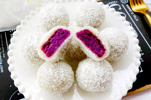 內(nèi)餡:紫薯 280克、煉乳 10克、牛奶 20克、椰蓉 適量