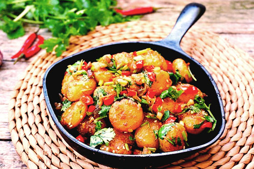 9、土豆收干后,放一點(diǎn)雞精,攪拌均勻后關(guān)火。把熟白芝麻、香菜撒上,裝盤。
