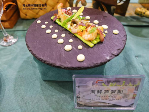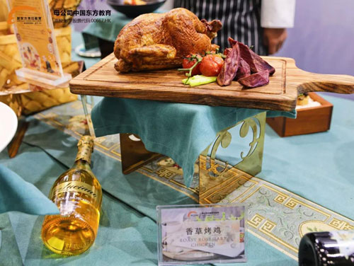新東方烹飪教育上海院校本次參賽作品為“感恩節(jié)主題宴會(huì)擺臺(tái)”,這是為喜迎感恩節(jié)而專門制作,6位參賽學(xué)子通過巧妙的配合與靈活的創(chuàng)意,輔之以精妙的制作,從準(zhǔn)備食材、處理食材、刀工、調(diào)味、控火等方面都力求盡善盡美,以香草烤雞、海鮮蘆筍船、蘆筍鵪鶉蛋色拉、黃瓜生蠔配黃桃晶球、低烹大蝦配時(shí)蔬凍等西餐美食擺臺(tái)為即將到來的感恩節(jié)獻(xiàn)上了一份賀禮。這些作品不僅色澤明艷、香味四溢,讓人食指大動(dòng),而且在經(jīng)過學(xué)生講解制作創(chuàng)意后,更增添了一份溫度。
