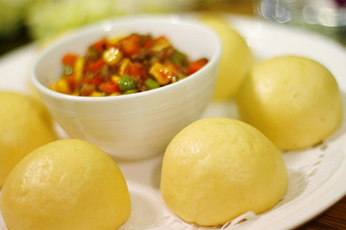1、將玉米面、白面粉用熱水和勻揉成面團,下劑后用手捏成窩窩形狀,在窩窩內(nèi)加入拌好的餡子,撮窩窩的上邊緣,逐漸團成圓團,上籠蒸熟即成。