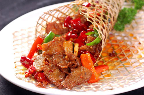2、另鍋上火,下入青紅椒、洋蔥、干辣椒爆香,放入牛柳、老干媽、孜然、香菜等調(diào)料,快速翻炒起鍋,淋入香油裝入竹笆內(nèi)即可。