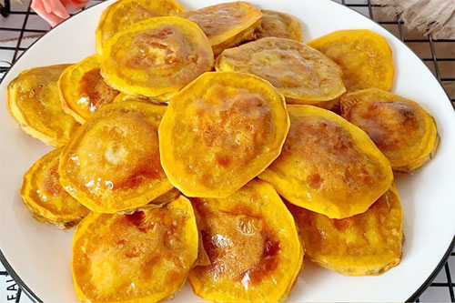 3、烤箱180度預(yù)熱、紅薯片均勻沾上蛋液。