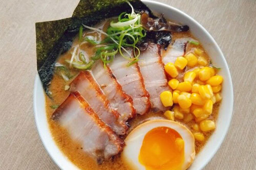 5、配上半熟蛋,玉米,蔥絲,木耳,海苔,辣椒油即可。