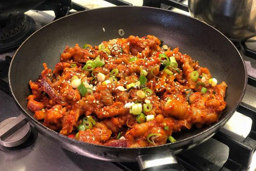 制作食材:雞爪 16只、燒酒(或者白酒、米酒) 60ml、黑胡椒粒 10粒 、大蔥 5小段、洋蔥 1/4個(gè)、大蒜 2瓣、鮮小辣椒 6個(gè)(酌情增減)、韓國(guó)辣醬 2勺、麻油 1勺、韓國(guó)辣椒粉(粗) 5勺、玉米油 1.5勺、辣椒面 1茶勺、姜粉(生姜) 少量、生抽 3勺、蜂蜜 1勺、胡椒粉 適量 、食用油 適量(較少)、小蔥綠 1小把、水 2勺、紫蘇葉(可不用) 適量、白芝麻 適量