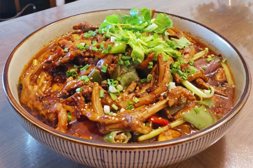 14、然后將雪豆和鴨掌同時下鍋,翻動的時候要小心,因為鴨掌雪豆都很軟爛了,翻炒太用力會碰壞,再將四個配菜和青紅甜椒下鍋翻炒,加生抽、老抽、香油、五香粉、孜然粉、白胡椒粉、鹽、白糖,翻炒均勻,加鹽的時候,沒把握的親注意嘗一下咸淡再加。