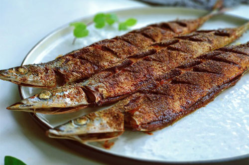制作食材:秋刀魚 3條、鹽 3克、生抽 1勺、料酒 1勺、姜 適量、橄欖油 半勺、孜然粉 適量