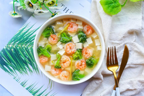 制作食材:西蘭花 80克、蝦仁 10個(gè)、豆腐 100克、姜 1片、料酒 1勺、胡椒粉 1勺、鹽 1小勺、蒜 3粒