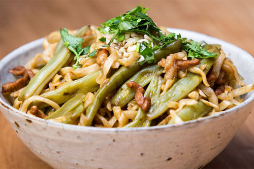 8、用筷子將豆角、面條和湯汁攪拌均勻。出鍋后,放上剁好的蒜末、香菜末,加些香醋,和面一起拌勻即可。