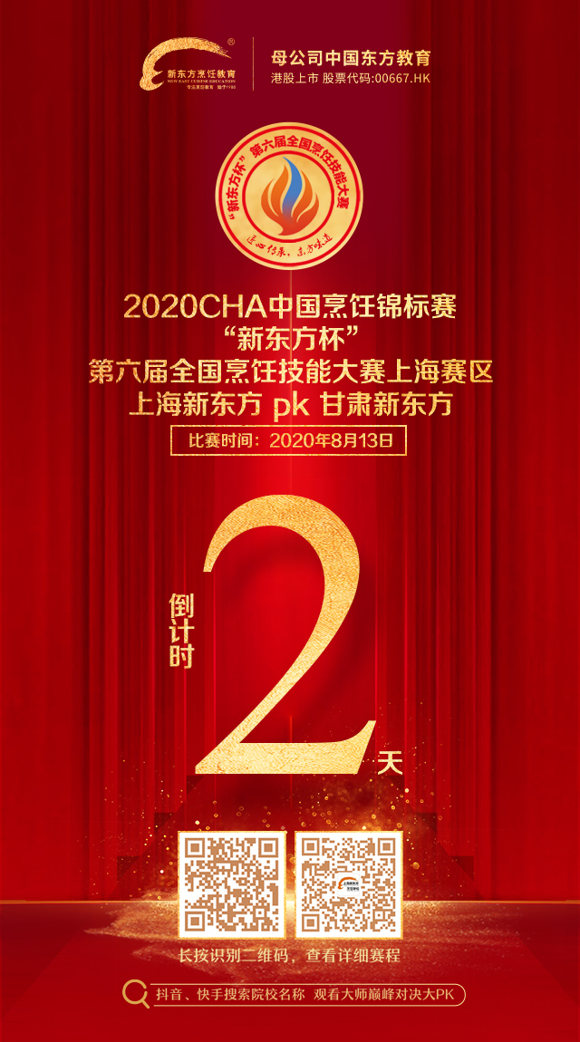 由中國飯店協(xié)會、中國東方教育主辦,將于本周四,2020年8月13日,上海新東方烹飪學校將正式舉辦“新東方杯”第六屆全國烹飪技能大賽,搭建新東方烹飪教育與社會需求的橋梁,激勵廣大學子刻苦鉆研烹飪技藝,不斷提高創(chuàng)新意識和技術水平,提升教學品質和整體教學短視頻質量,促進院校健康穩(wěn)步發(fā)展。