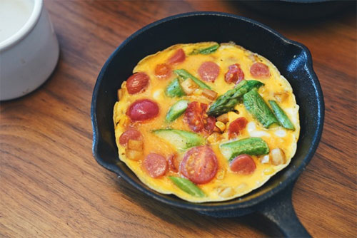 6、再倒入適量蛋液,待蛋液凝結(jié),小心卷起,盡量卷緊一點。
