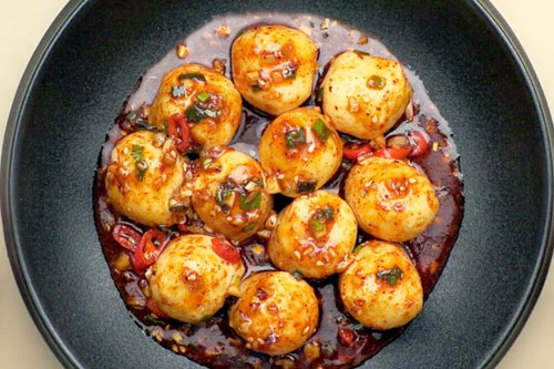 制作食材:魚丸 220g、蒜末 20g、小蔥 15g、辣椒粉 8g、小米辣 15g、五香粉 3g、鹽 1g、白糖 5g、熱油 20g、生抽 10g、醋 10g、蠔油 10g