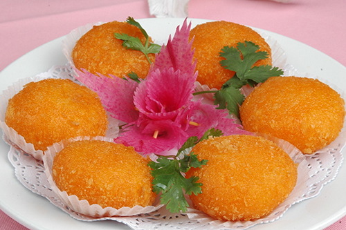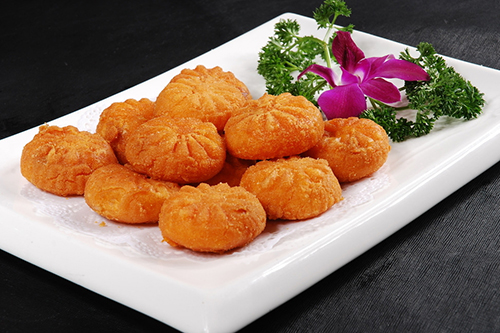 ?、坼亙?nèi)注入清油,待油溫升至120℃時,把南瓜餅放在漏勺內(nèi)入油中用小火浸炸,至南瓜餅膨脹,撈出待油溫再升至160℃時下餅炸至發(fā)脆時即好。