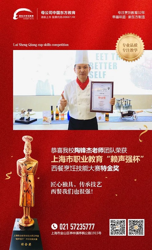 在剛剛結(jié)束的上海市職業(yè)教育“賴聲強(qiáng)”杯西餐烹飪技能大賽中,上海新東方陶鋒杰大師團(tuán)隊(duì),在參賽的十八家職業(yè)教育機(jī)構(gòu)中,脫穎而出,榮獲大賽特金獎(jiǎng)。