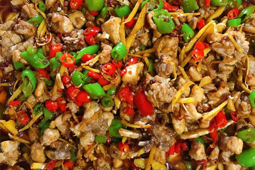3、起鍋燒油把兔肉下鍋過(guò)油,撈出瀝干待用,接著先把姜和蒜,下鍋爆炒出香味,花椒,然后挖2??勺豆瓣醬炒出紅油,最后把兔肉和辣椒到鍋里翻炒,水、鹽和雞精燒開(kāi)入味出鍋即可。