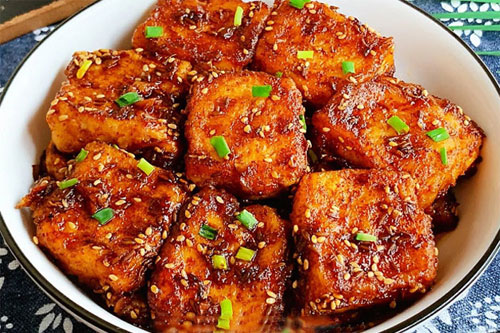 制作食材:老豆腐 1塊、雞蛋 1個、玉米淀粉 適量、1勺蒜末 、1勺孜然粒 、1勺芝麻 、1勺辣椒粉,淋上熱油 、1勺孜然粉、 、2勺生抽 、2勺陳醋 、1勺蠔油 、1勺白糖 、少許鹽。