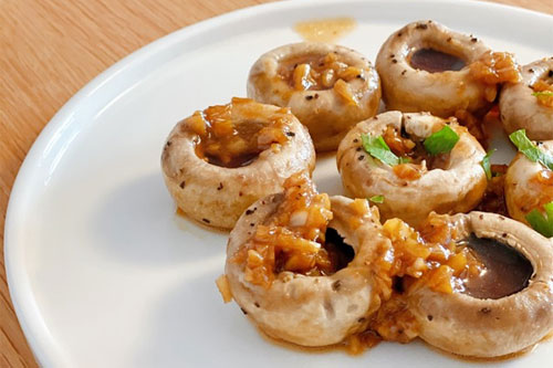 5、開大火,把剩下的蒜汁收干,用小勺淋在蘑菇上面,撒上一點(diǎn)芹菜葉即可。