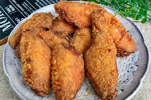 2、腌好后裹一層玉米淀粉,鍋中油燒至六七成熱,放入雞翅小火炸10分鐘左右,金黃色撈出