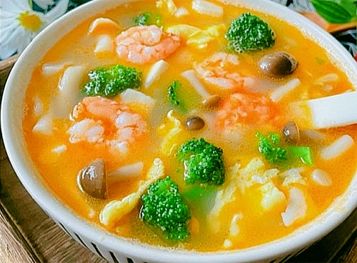 8、放進(jìn)豆腐塊和蝦仁,加適量鹽和雞精,再次燒開,放入雞蛋碎和西藍(lán)花,輕煮一分鐘即可。
