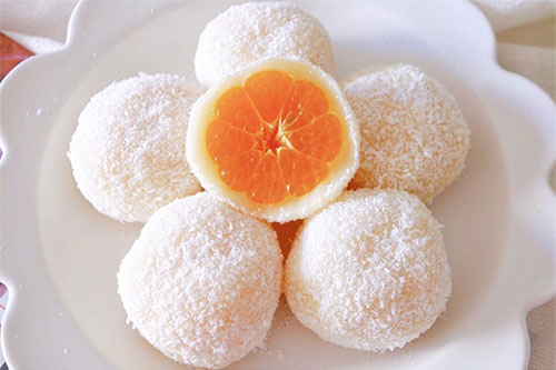 3、蒸熟以后揉均勻,放入冰箱冷藏30分鐘,分成均等的6等份,橘子去皮,糯米團(tuán)壓扁包入橘子,再裹上椰蓉即可。