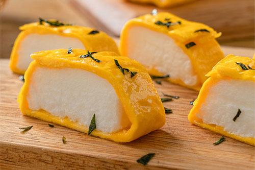 2、熱鍋刷油,倒入蛋黃液定型,加入蛋白霜稍微整一下形,把煎好的云朵厚蛋燒取出切塊,撒上海苔碎即可。