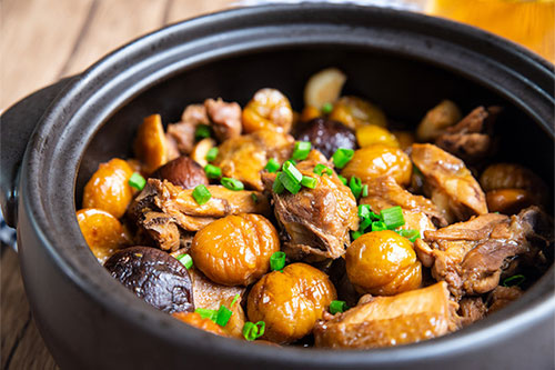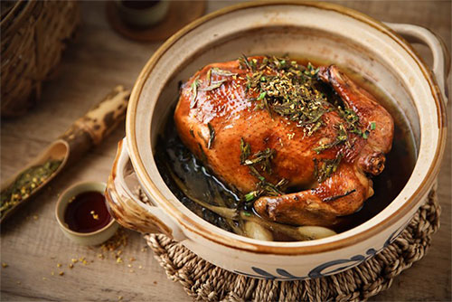 6、把塞好香料的雞,雞背朝上放入砂鍋中,然后倒入300毫升腌制雞肉的湯料,再稍微加100毫升的開水,蓋上蓋子放進(jìn)蒸烤箱,高溫烹飪40分鐘后翻面繼續(xù)高溫蒸25分鐘。