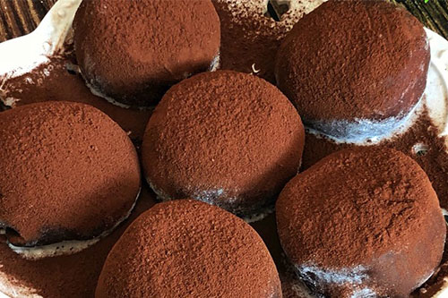 4、案板上撒點(diǎn)熟糯米粉放粘,再把皮搟成薄皮,包入冷凍好的奶酪陷,收口捏緊,再撒上可可粉即可。