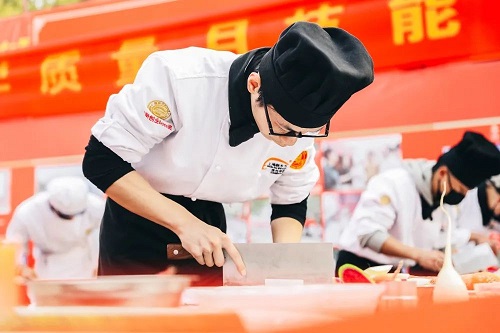 這場刀工技能比武的內(nèi)容是在規(guī)定時間內(nèi)完成絲、條、塊、片等項(xiàng)目,隨著裁判老師一聲令下,刀工比武(預(yù)賽)就此展開,同學(xué)們精氣神十足,專心于讓平凡的食材以各種形狀展現(xiàn)在大家眼前,讓這看似普通的比賽變成一場視覺盛宴。