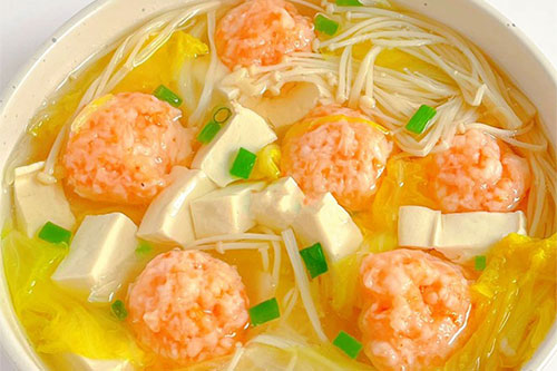 3、金針菇去根部洗凈,放入雞湯中煮熟,撈出鋪入碗底。