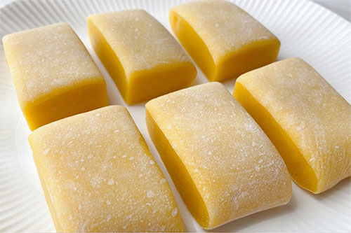 3、蒸好的南瓜麻薯趁熱加入黃油,稍微冷卻一下揉成光滑的糯米團(tuán),包保鮮膜整理成長(zhǎng)方形,完全冷卻后撒少許熟糯米粉,切小塊即可。