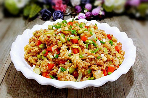 制作食材:鮮貝、蝦、肉餡、蛋、米飯、毛豆、胡蘿卜、蔥、姜、蒜、蠔油、醬油、鹽