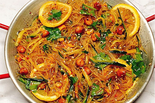 2、起鍋煮熟粉絲,撈出過涼水,放入黃瓜絲,花生米,香菜,檸檬片,倒入醬汁,抓拌均勻即可。