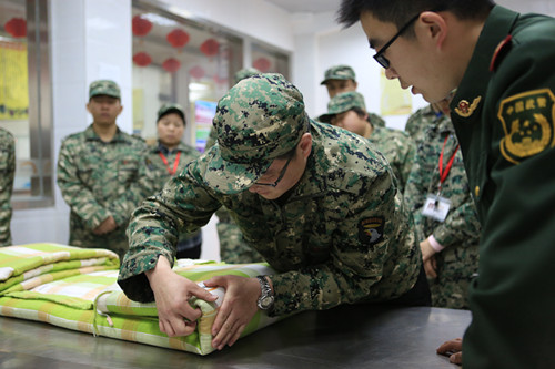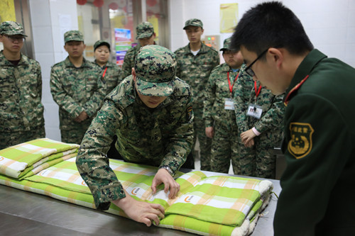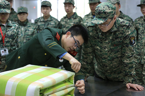 教官對(duì)學(xué)生們疊好的豆腐塊被子進(jìn)行專(zhuān)業(yè)指導(dǎo)