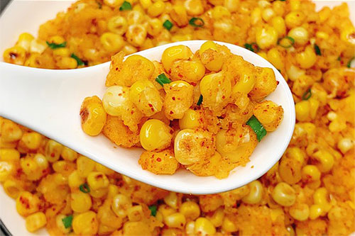 3、起鍋熱油,倒入玉米粒,小火煎至一面定型,炒散,煎至微黃。