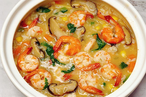 制作食材:鮮蝦 半斤只、米 半杯、干香菇 4朵、青菜 1顆、胡蘿卜 半根、玉米粒 適量