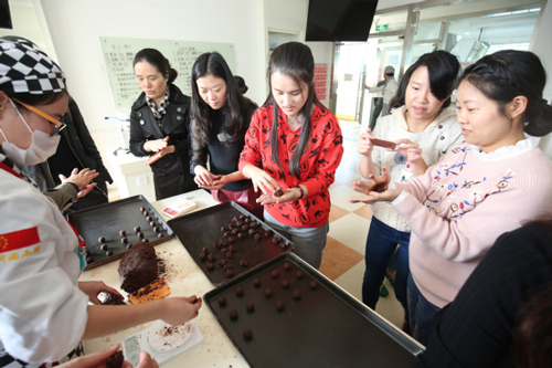 體驗課的第一項是專業(yè)西點大師講解西點制作的理論知識與操作步驟。除了專業(yè)的老師外學(xué)生也與婦聯(lián)的工作人員共同完成體驗課的西點作品。在校學(xué)習(xí)了一段時間的學(xué)生們手法已相當(dāng)純熟,給予婦聯(lián)同志們很大幫助。在經(jīng)過同學(xué)、老師、婦聯(lián)同志們?nèi)烬R心協(xié)力下西點作品香噴噴地出爐了。在品嘗過之后都表示味道很贊!